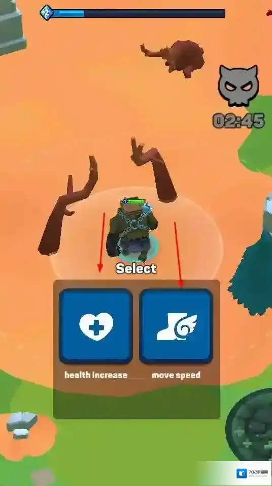 2、“战斗技能选择”,战斗中弹出技能选项,选择提升生命或移速,增强战斗能力。