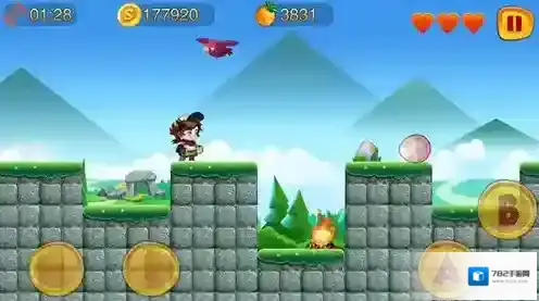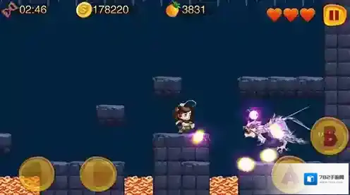 3、通过屏幕下方【A】【B】按键操控角色,收集金币,橙子等,注意躲避障碍和获取道具。