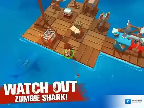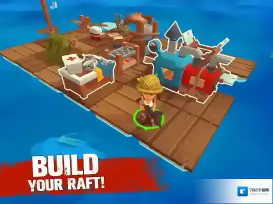 2、屏幕左下角的虚拟摇杆可控制角色移动,操控角色在木筏上及周围水域移动,收集漂浮的资源(如木板)。