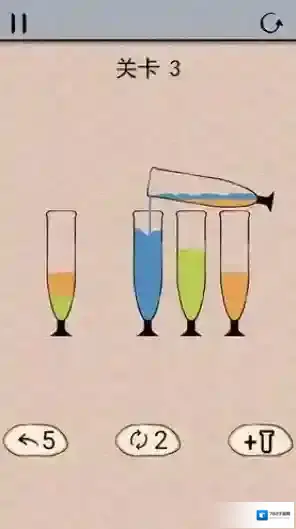 1、采用色彩液体调配为核心玩法,基于流体力学原理设计,液体倾倒过程会呈现真实的流动轨迹和混合效果。操作仅需简单点击,但需要精心规划每一步移动策略,确保在有限步骤内完成任务。