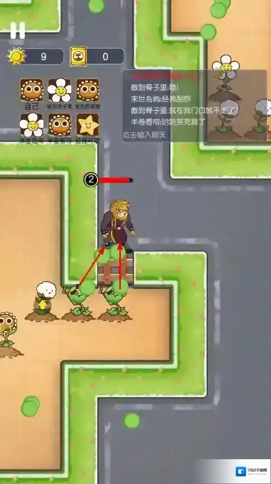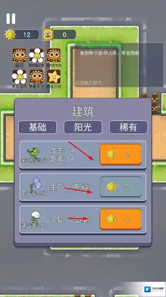 1、“种植植物”,消耗阳光,在领地种植豌豆炮台(攻击)、牵牛花(产肥料)等植物,构建防线。