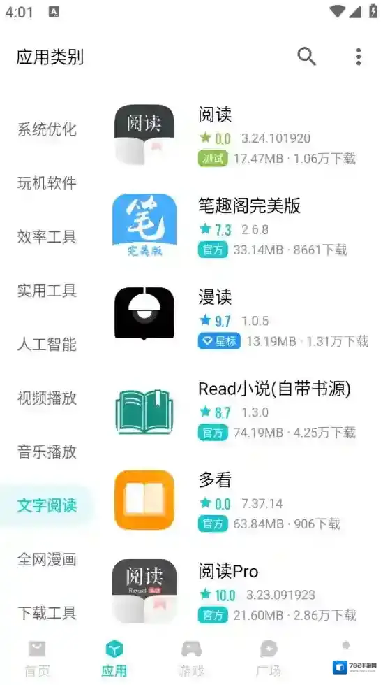3、在“应用”页面,左侧栏目有详细的应用分类,包括影视、小说以及漫画等等类型。