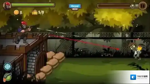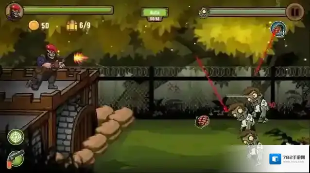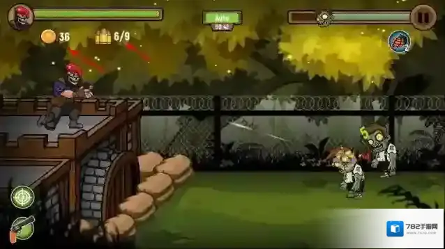 3、“防御阵地”,利用武器(手枪、炸弹),阻止多波僵尸靠近堡垒,守护生存区域。