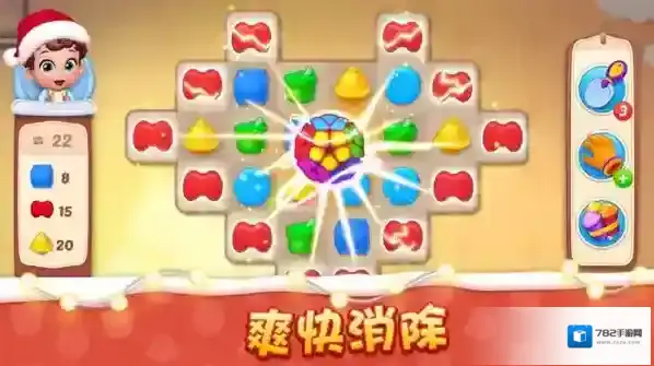 1、三消闯关策略操作:滑动消除同色元素完成任务,合理利用道具组合清场,在限定步数收集物品推进剧情。