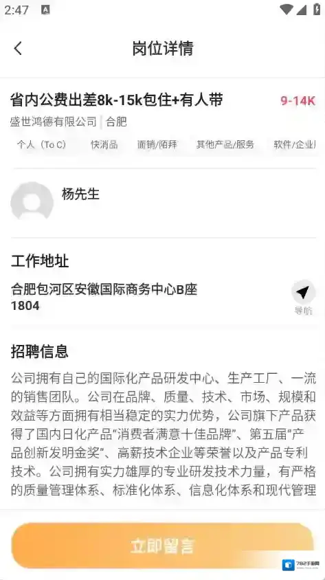 5、点开有意向的工作,直接点击“立即留言”即可。