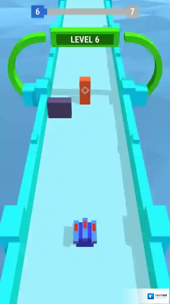 2、推进到Level6,观察红色箭头指引,调整小车位置,射击路径上的橙色目标,避开紫色方块。