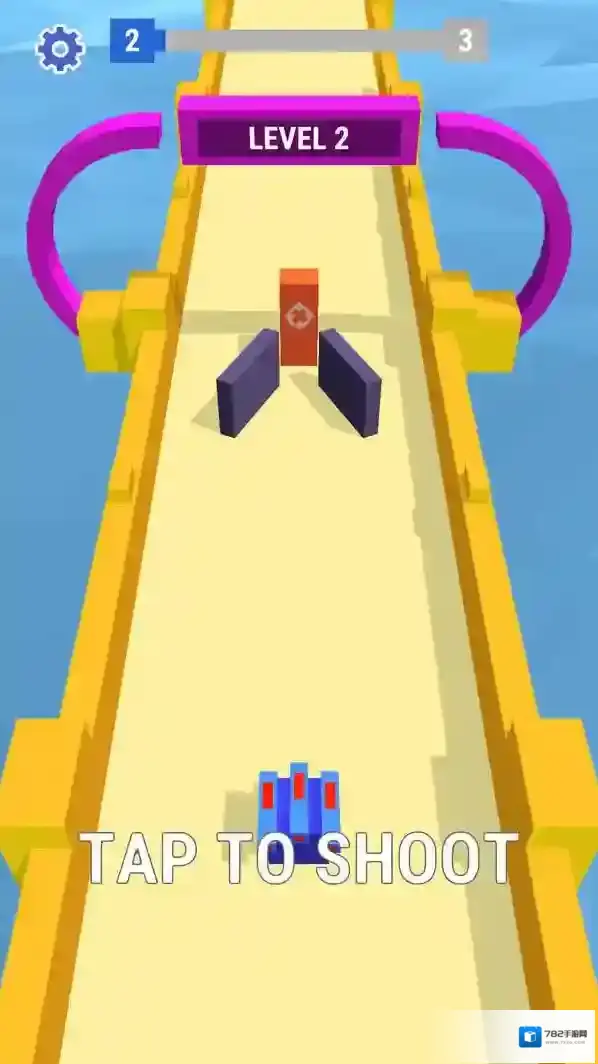 1、进入Level2,按提示“TAP-TO-SHOOT”,点击屏幕让蓝色小车射击橙色目标,注意躲避紫色障碍。