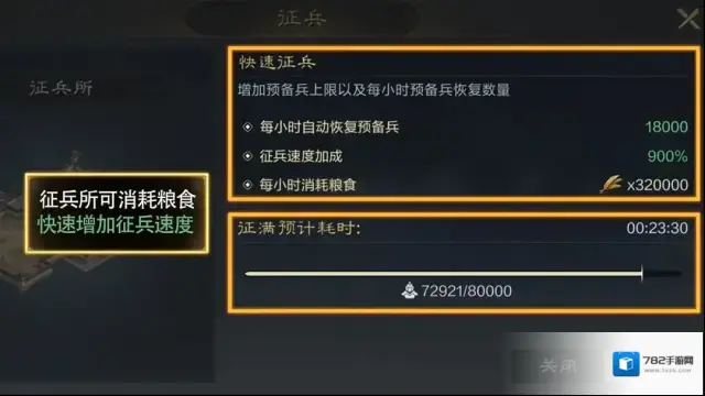 三、粮食作用:粮食主要用在征兵所,同时城外营帐中征兵时,也需消耗粮食。