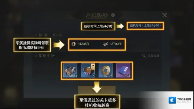 军演左下方可领取挂机奖励,获得储备经验和铜币。军演通过的关卡越多,挂机收益越高,还有几率获得稀有掉落物。但挂机时间上限为24小时。