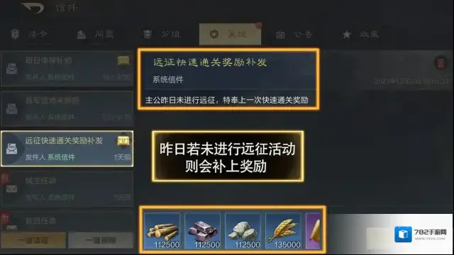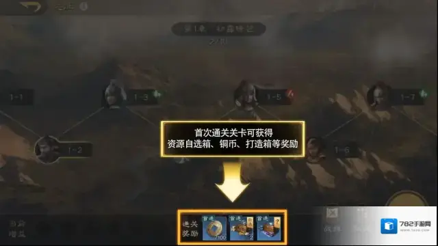 在远征中,首次通关关卡可获得资源自选箱、铜币、打造箱等奖励,重复扫荡关卡则获得基础资源奖励。