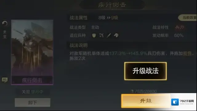 1、提升等级,每提高一级可以增加100带兵数量,还能增加属性,解锁新的战法格、韬略、装备。