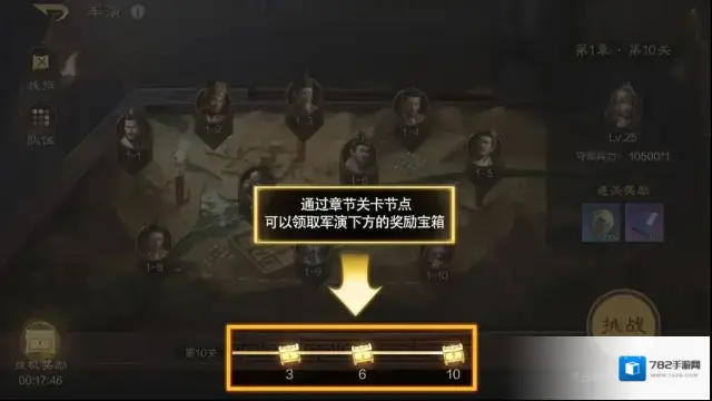 通过章节关卡节点(3、6、10),可以领取军演下方的奖励宝箱,宝箱能够获得铜币、并且某些宝箱还附带相马令和天赋经验等物品。这是前期快速获取铜币的途径,也是获得相马令的好地方。