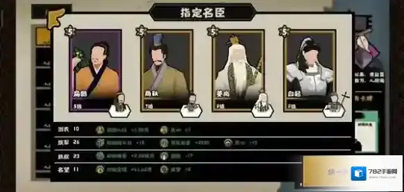 此搭配战斗力强,但获取难度较高,建议氪金玩家优先考虑。包括扁鹊、商鞅(可用张仪代替)、姜尚、白起,拥有无可匹敌的军事能力。前期即可获得高额战斗力和军心加成,出征胜利可夺取军心、民心。姜尚还有封神和奇袭技能,扁鹊可范围回复生命值。此搭配前期可快速扩张,速推必备。