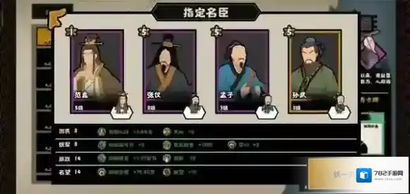 此搭配包括范蠡、张仪、孟子、孙武,核心为张仪、范蠡、孟子。三者技能相辅相成,张仪提高他国好感度,便于前期结盟,触发范蠡和孟子技能,大幅提升钱粮产量。孙武技能出征胜利即可获得威望,威望超过七十时,可触发与张仪、范蠡的用间技能,提升战斗力和用间等级。此搭配前期钱粮收益极高,无负面效果。