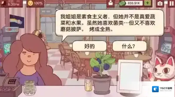 3、有一个粉色头发头上有颗草的姐姐要用特殊礼物换免费披萨。点“是”给她做什么都可以。我做的是酱料+芝士+意大利辣肠。送了一个花盆,可以种出来茄子。
