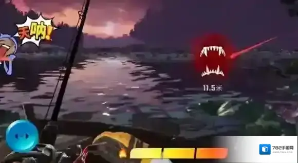 3、等待鱼儿咬钩,一旦有鱼咬钩,迅速长按右侧的操作键进行钓鱼。