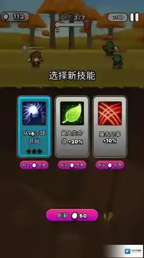 4、每一波解锁会随机获得三个技能,玩家需要消耗小球数量来购买一个技能强化自己。