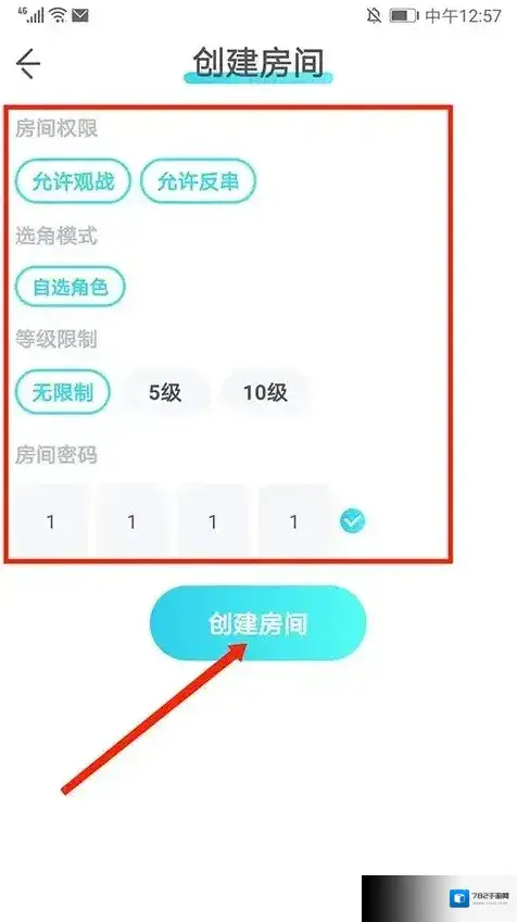 2、进入创建房间界面后,设置房间权限、选角模式、等级限制以及房间密码。