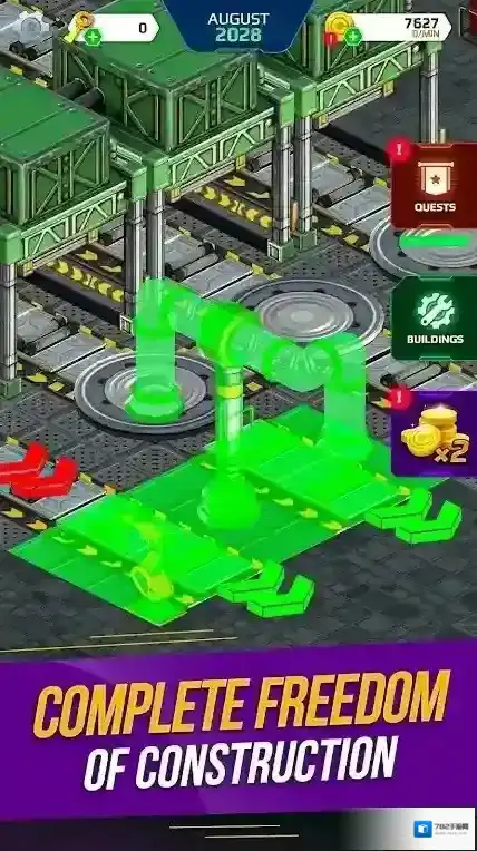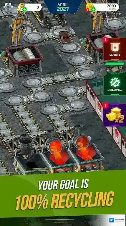 3、货币数值7603、功能按钮GUESTS(访客)、BUILDINGS(建筑),呈现工厂设施(如机械、熔炉等),玩法为管理工厂生产、建设设施、接待访客等。