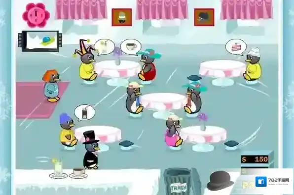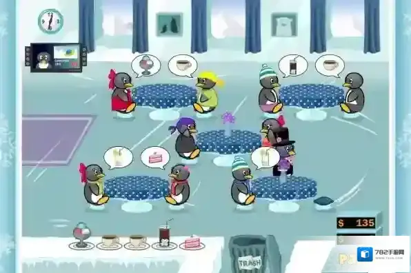 1、日常经营操作:玩家需点击顾客快速安排就座,顾客招手时及时上前点餐,随后操控企鹅员工取餐上菜,全程考验手速与反应力。