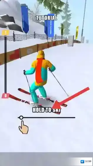 1、在TUTORIAL阶段,长按屏幕HOLD TO SKI,控制滑雪者在雪道滑行,熟悉操作。