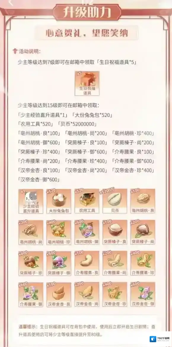 2、为玩家提供了升级助力,玩家等级达到7级即可在邮箱中领取「生日祝福道具*5」,等级达到15级即可在邮箱中领取大量升级道具。