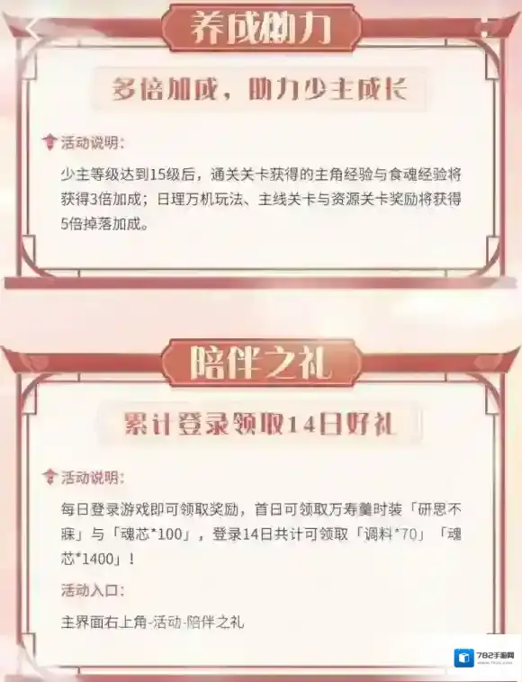 4、游戏养成难度降低,为玩家提供多倍材料掉落的养成助力,首日登录送万寿羹时装「研思不寐」,累计登录14天免费赠送1400抽。