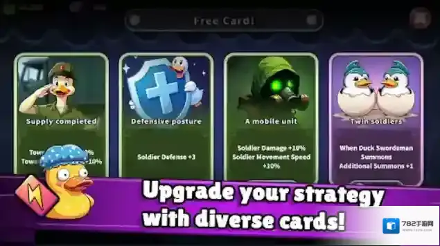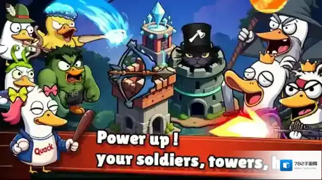 1、自由搭配各种类型的鸭子士兵,并召唤强大的英雄鸭,建造不同功能的防御塔,击败所有入侵的敌人。