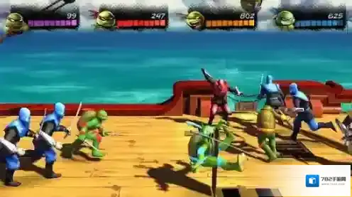 1、卡通渲染技术复刻90年代漫画质感,角色龟壳采用动态物理建模,双叉武器攻击时触发金属碰撞粒子流,神龟跳跃落地产生漫画式冲击波特效。