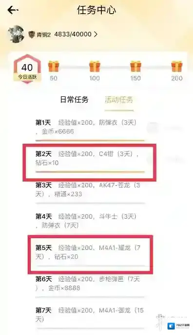 5、每天完成一些简单任务(标记为红框的任务),一个月累积可获得约600积分,其中400积分可用于兑换100钻石。