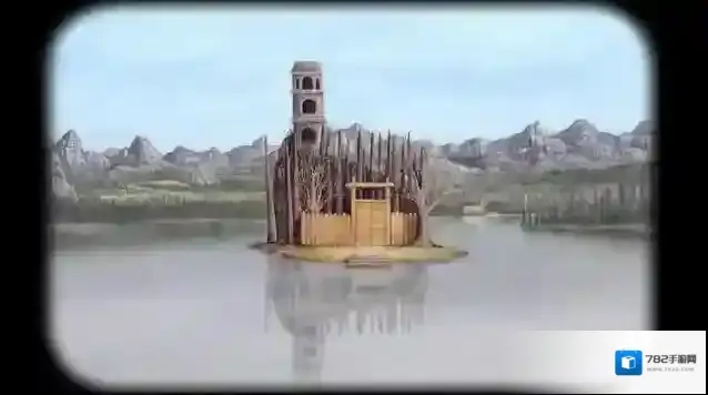 8、来到锈湖后,查看左边的血水,点击一下会从水里冒起来一口棺材,我们将周围钉子全部拿掉后拿到一个黑色方块。完成之后我们把黑色方块放入右边建筑物里的吊饰中,第一关结束。