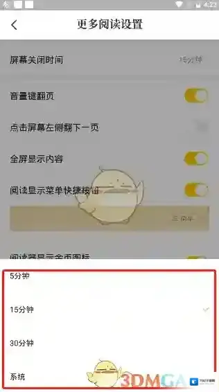 5、然后系统就会弹出“5分钟”“15分钟”“30分钟”“系统”四个选项,用户也是可以根据自己阅读的习惯来进行调整。