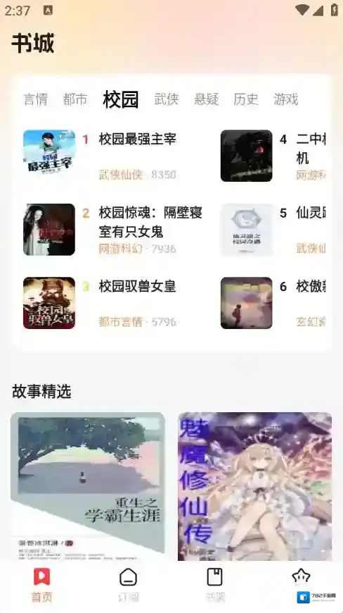 2、首页有很多的小说类型,言情、悬疑以及历史等类型。