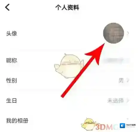 3、打开个人资料界面点击“头像”,然后再去点击弹窗中的“拍照”。