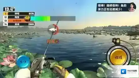 5、钓到鱼后,点击收线按钮,当鱼力竭后,即可成功将其钓起。