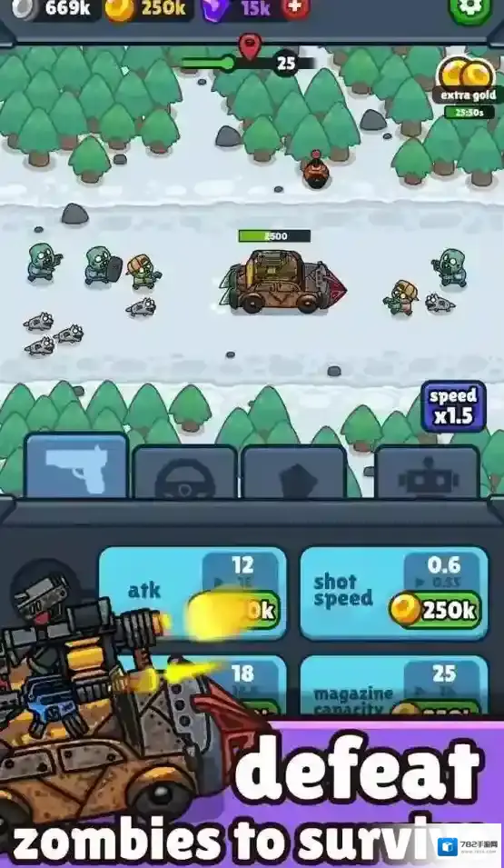 2、进入关卡后车辆会自动攻击僵尸,击败僵尸可以获得丰富奖励。