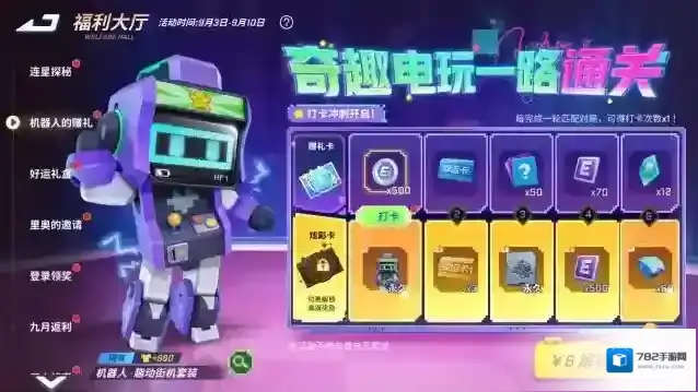 活动时间09月08日–10月05日诶?小绵羊叫上他的好朋友小恐龙来和少年们一同畅玩电玩城啦!机器人·趣动街机套装活动期间,少年们登录即可获取打卡次数!打卡即可领取奖励~角色碎片在等着你呦!升级至炫彩卡,少年们还可以解锁机器人·Alpha8的全新时装,打卡5日全额返钻!里奥的魔术小羊